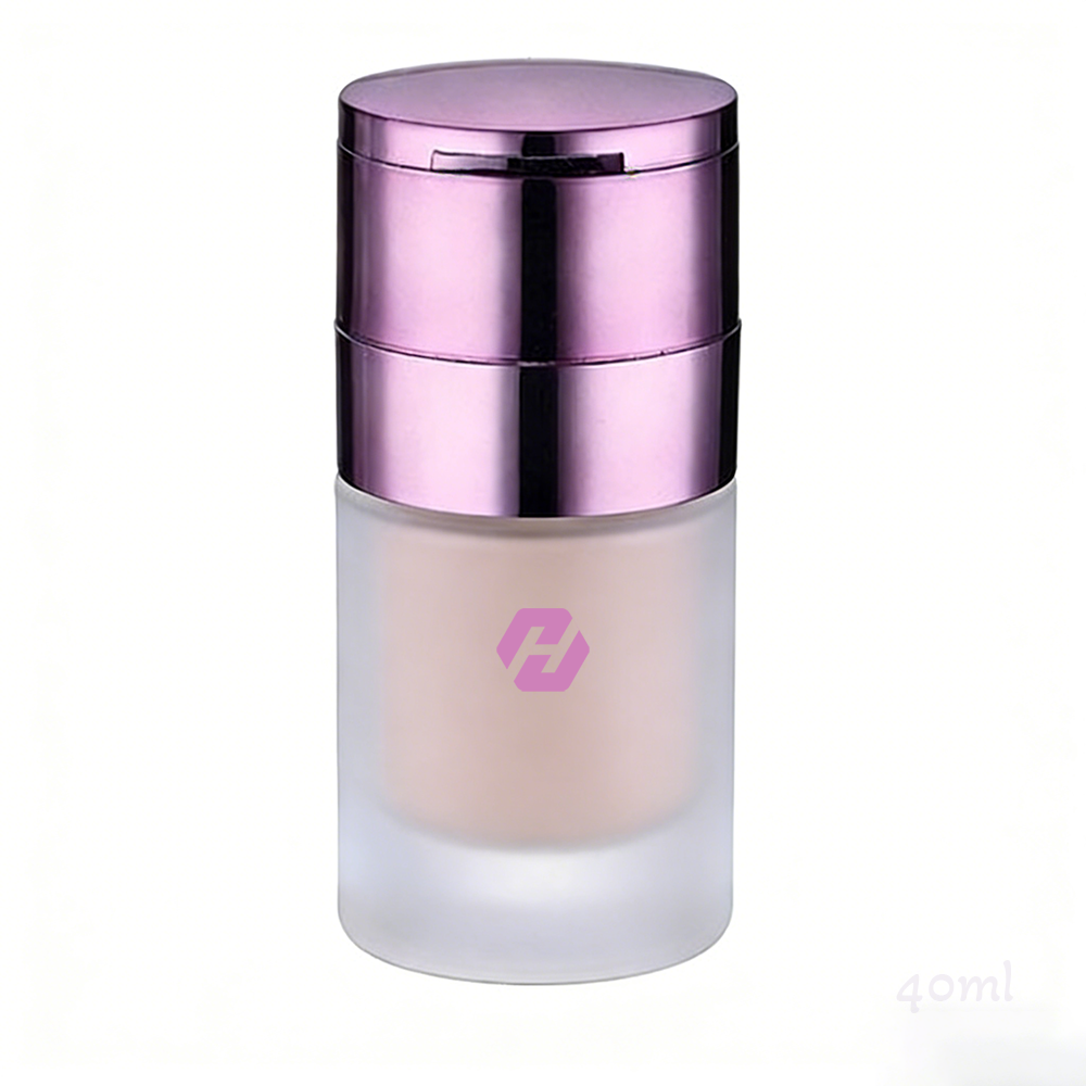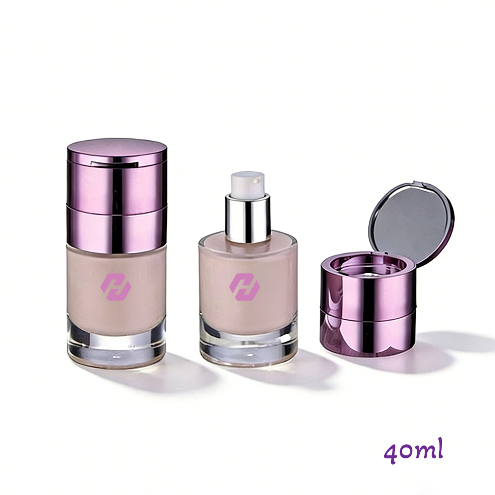 The architectural profile of this 40ml dual-functional system is defined by its vertically stacked, high-transparency glass base and a metallic violet electroplated finish. Unlike standard monolithic vials, the visual geometry here centers on a hybrid composition: a cylindrical glass reservoir that reveals formula true-color, contrasted against a high-reflectivity cap assembly. This dual-layer configuration creates a professional, multi-instrument aesthetic that immediately signals high-utility to the end consumer, making it a centerpiece for luxury cosmetic collections.